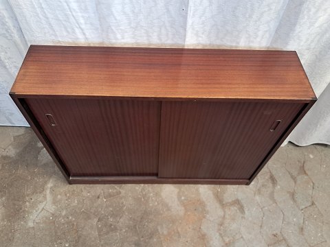 Reol i finert mahogni med skydelåger, fra 1980erne.